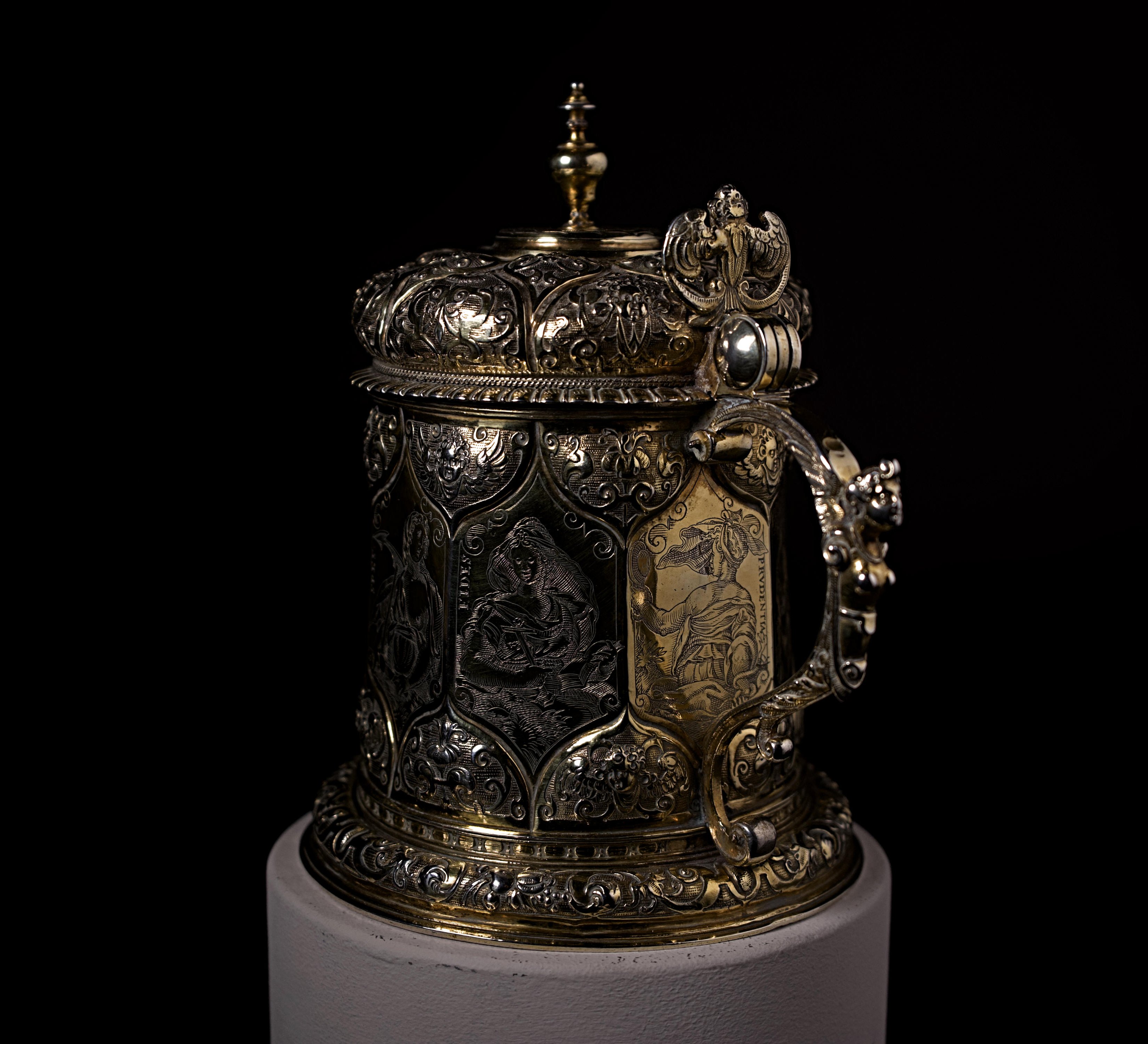 facettierter, achteckiger Körper, umlaufend graviert mit Allegorien der sieben himmlischen Tugenden und der Geduld nach Stichvorlagen aus dem Jahr 1595 von Jacob Matham (1571–1631, tätig in Haarlem), nach Hendrik Goltzius (1558–1617)